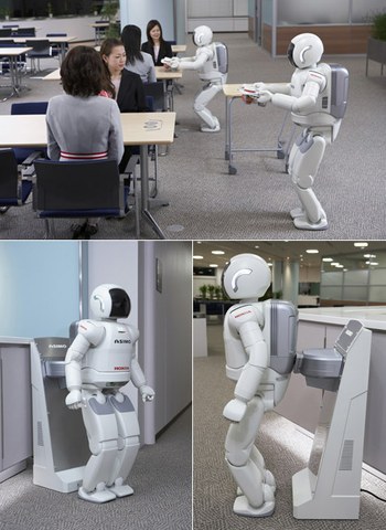 Be viso šito, robotas išmoko elgtis su staleliu ant ratų – jis jį sugeba stumti reikiama kryptimi, apsukti ir jei reikia traukti. Be to, pats ASIMO nuolat stebi savo energijos resursus ir nepamiršta karts nuo karto savarankiškai prieiti prie pakrovimo stotelės ir prie jos prisijungus pasikrauti iki reikiamo lygio.