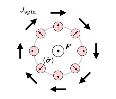 Jėga F sužadina sukinių σ srovę Jspin statmenoje tai jėgai plokštumoje