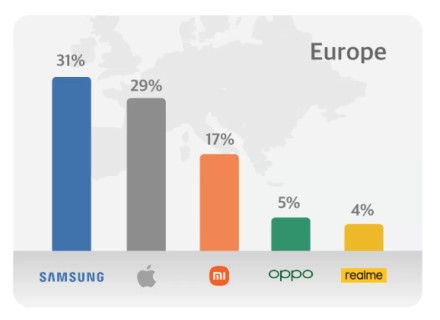 Kalbant apie populiariausius gamintojus Europoje – čia lyderiauja „Samsung“, kuri sudaro 31 proc. Antroje vietoje rikiuojasi JAV milžinė „Apple“, o trečioje „Xiaomi“. Įdomu tai, jog ketvirtoje pozicijoje randame „Oppo“, o penketuką užbaigia „Realme“.