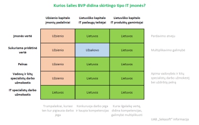 Palyginti santykinai, lietuviško kapitalo paslaugų tiekėjai ar produktų gamintojai Lietuvos BVP augina 5–12 kartų daugiau nei užsienio kapitalo įmonių IT padaliniai. Pateiktose lentelėse matyti, kad mažiausiai Lietuvai naudingi užsienio kapitalo įmonių IT padaliniai, pvz., paslaugų centrai, o daugiausiai naudos specialistams, bendrovių savininkams ir šalies biudžetui duoda lietuviško kapitalo IT paslaugų tiekėjai ir produktų gamintojai bei eksportuotojai (lentelėje skaičiai santykiniai).