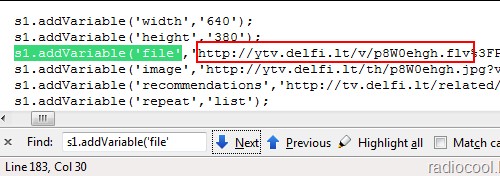 Būdami „Delfi TV“ video puslapyje paspauskite Ctrl+U ir pamatykite puslapio išeities tekstą. Pradėkite paieška su Ctrl+F ir ieškokite s1.addVariable(‘file’ ir štai rasite nuorodą į video failą.