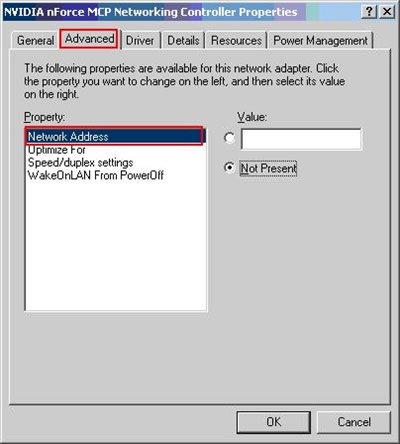 Locally Administered Address gali būti pavadinimu Network Address. Pažymite Value ir įvedate MAC adresą. Jeigu norite atstayti į gamyklinį MAC adresą – pažymite Not Present.