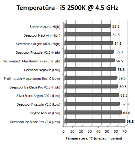 Procesoriaus dažnį užsukus iki 4,5 GHz. „Deepcool Neptwin“ eina koja kojon su „Scythe Ashura“. Veikdamas žemomis apsukomis „Neptwin“ pasirodo geriausiai. „Deepcool Frostwin V2.0“ įsiterpia tarp „SilverStone Argon AR01“ ir „Prolimatech Megahalems Rev. C“.
