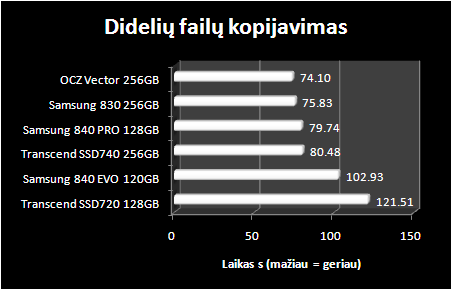 SSD greitis paprastai kinta priklausomai nuo duomenų suspaudimo bei failų dydžių, tad atliekame kelis kopijavimo testus. SSD viduje kopijuojami keli dideli archyvai ir didelis kiekis JPG nuotraukų, ZIP archyvų bei programos instaliaciniai failai. Išskleidimo teste naudojant „7-Zip“ programą išskleidžiami du dideli „7z“ archyvai bei 430 mažų ZIP archyvų.