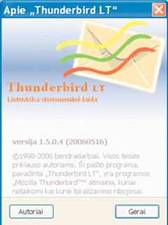 Prieš pusantrų metų buvo sulietuvinta elektroninio pašto programos „Mozilla Thunderbird“ pirmoji stabili versija 1.0. Nuo šios versijos keitėsi programos projektavimo, lokalizavimo ir platinimo tvarka – programos pavadinimas „Mozilla Thunderbird®“ ir logotipas tapo registruotais prekės ženklais, buvo priimtos šių prekės ženklų naudojimo taisyklės, šiek tiek ribojančios programos lokalizavimą ir platinimą.