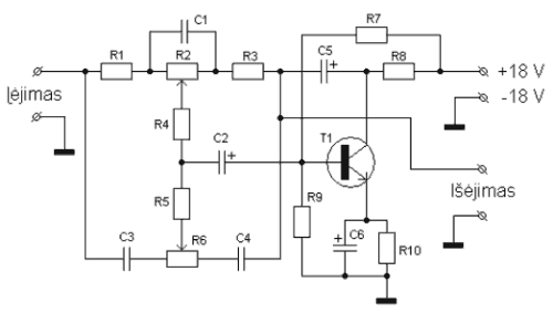 Tai nesudėtinga tembro reguliatoriaus shema. Ji gerai tinka pradedantiesiems, nes sudaryta iš diskretinių elementų, kuriuos praktiškai galite rasti išardę bet kokį elektroninį prietaisą. Veikimo principas pagrįstas signalo filtravimu RC grandinėlėmis.