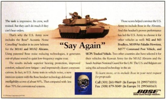 1998 metų reklama „Bose“ ausinių, naudojamų tanko vairuotojo ir įgulos © „Army Magazine“