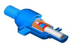 ![]() Laisvo stūmoklio variklyje strypas su stūmokliais kiekviename gale juda tarp dviejų degimo kamerų. Strypo centre esantis magnetas juda pro metalines apvijas (oranžinė spalva) ir taip sukuria jose elektros srovę (©Peter Van Blarigan, Sandia National Laboratory) |