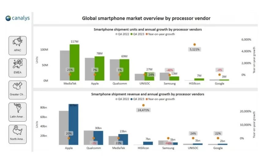 Analitikų bendrovė „Canalys“ neseniai paskelbė 2023 metų paskutinio ketvirčio duomenis, kurie atskleidžia, jog „MediaTek“ procesorius naudojo dauguma minėtuoju periodu parduotų išmaniųjų telefonų. Ketvirtojo metų ketvirčio metu buvo parduota daugiau nei 117 mln. telefonų su šios bendrovės lustais, o tai rodo 21 proc. metinį augimą.