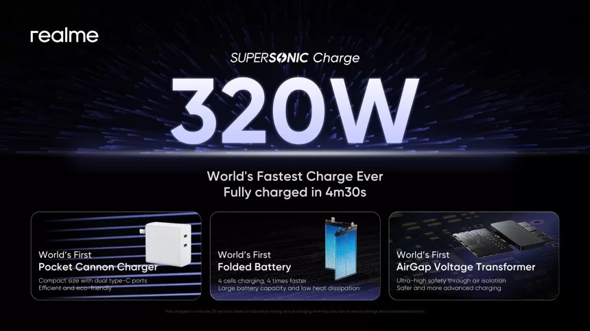 „Realme“ teigia, kad ši 320 W „SuperSonic Charge“ technologija visiškai įkrauna išmaniojo telefono bateriją per 4 minutes ir 30 sekundžių. Per vieną minutę ji įkrauna bateriją iki 26 proc., o daugiau nei 50 proc. bus galima pasiekti per mažiau nei dvi minutes.