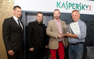 „MRG Effitas“ atstovai (iš kairės) Zoltanas Balazsas, Sveta Miladinovas ir Chrisas Pickardas įteikia apdovanojimą bendrovės generaliniam direktoriui Eugene Kaspersky
