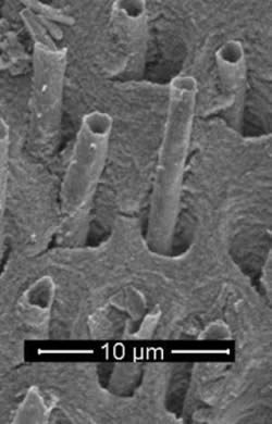 ![]() Elektroninio mikroskopo nuotraukoje gerai matyti kirminų pavidalo struktūros, „augančios“ iš giliai dantyje esančių porų. Merilendo universiteto nuotr. |