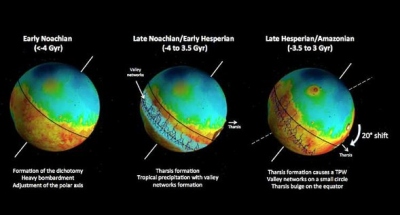 Toks įvykis leistų paaiškinti, kodėl didžiausiais Saulės sistemoje ugnikalniais garsėjanti Tarsidės sritis Marse (čia stūkso ne tik didžiausias Saulės sistemos ugnikalnis Olimpas (21 km), bet ir dar trys ne mažiau įspūdingi užgesę ugnikalniai) plyti ties planetos pusiauju.