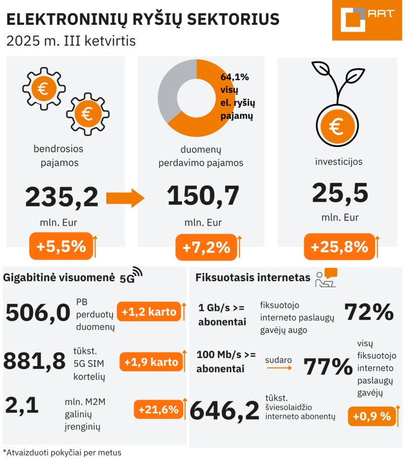2025 m. trečiąjį ketvirtį Lietuvos elektroninių ryšių sektorius fiksavo reikšmingą augimą – didėjo sektoriaus pajamos, investicijos ir duomenų vartojimas, o 5G technologijos naudojimas per metus išaugo beveik dvigubai, rodo Ryšių reguliavimo tarnybos (RRT) duomenys.