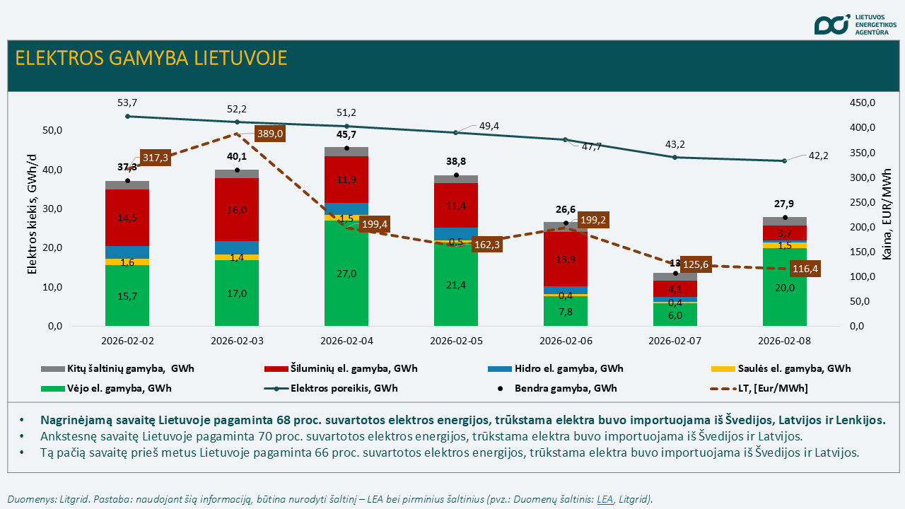 Vasario 2–8 d. bendra elektros gamyba Lietuvoje, palyginti su ankstesne savaite (235,6 GWh), sumažėjo 2,3 proc. ir siekė 230,2 GWh. Lietuvoje pasigaminta apie 68 proc. visos suvartotos elektros energijos, ankstesnę savaitę – 70 procentų.