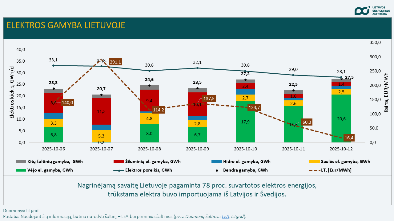 Bendra elektros gamyba Lietuvoje praėjusią savaitę siekė 169,2 GWh, arba 16,4 proc. daugiau, palyginti su ankstesne savaite. Per savaitę Lietuvoje pagaminta apie 78 proc. suvartotos elektros energijos, trūkstama elektra buvo importuojama iš Latvijos ir Švedijos.