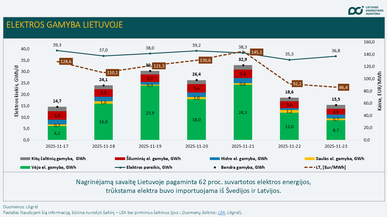 Bendra elektros gamyba Lietuvoje praėjusią savaitę siekė 162,6 GWh, arba 30,3 proc. daugiau, palyginti su ankstesne savaite. Per savaitę šalyje pasigaminome apie 62 proc. suvartotos elektros energijos, trūkstama elektra buvo importuojama iš Švedijos ir Latvijos.