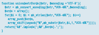 Norintiems el.pašto adresų slėpimo funkcijomis papildyti savo kurtas internetines sistemas pateikiame mažytę PHP funkciją. Pirmuoju funkcijos argumentu perduodama norimo užkoduoti teksto eilutė, antruoju – to teksto koduotė (jei ji ne UTF-8). Tipiniu atveju funkcijos rezultatas spausdinamas taip: