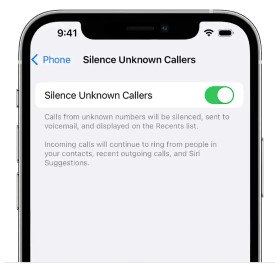 Norėdami įjungti funkciją „Silence Unknown Callers“, eikite į „Settings“ (nuostatos) „Phone“ (telefonas), tada slinkite žemyn, bakstelėkite „Silence Unknown Callers“ ir įjunkite šią funkciją. Skambučiai iš nežinomų numerių nutildomi ir siunčiami į balso paštą bei rodomi paskutinių skambučių sąraše.