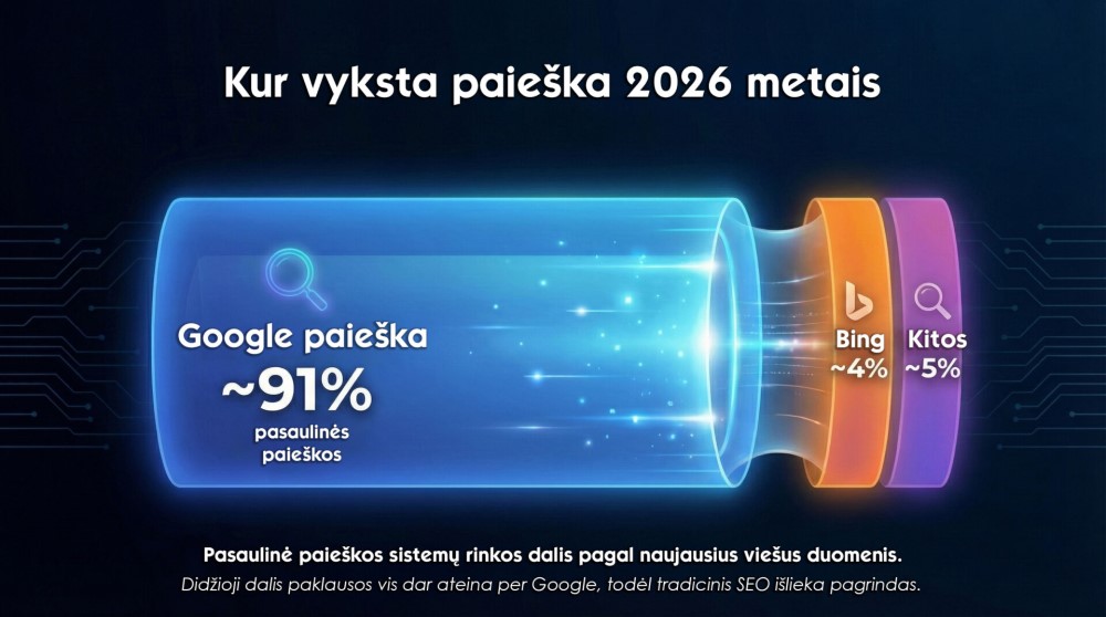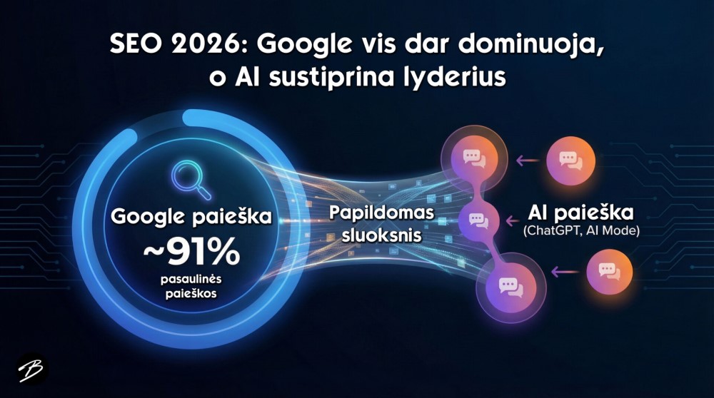 2026 metais tradicinis SEO ir AI paieška nėra konkuruojančios strategijos. Tai papildantys vienas kitą kanalai. „Google“ vis dar generuoja didžiąją dalį pasaulinių paieškų, todėl tvirtas SEO pagrindas yra būtinas. AI paieška tuomet sustiprina lyderius, darydama įtaką tam, ką vartotojai pasirenka, kuo pasitiki ir ką įsimena.