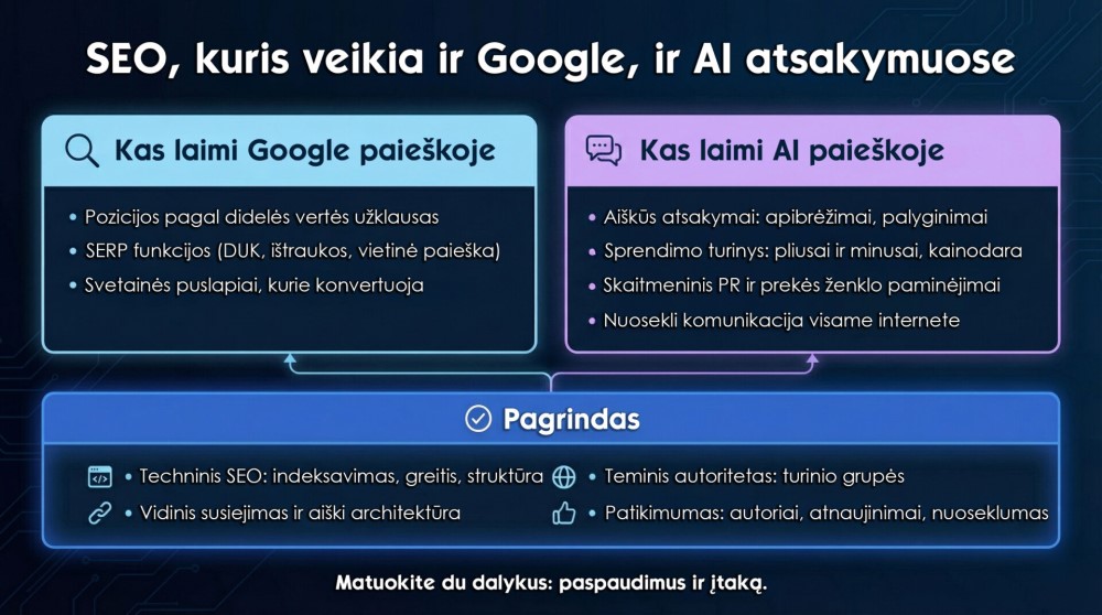 SEO, kuris veikia ir „Google“, ir AI atsakymuose