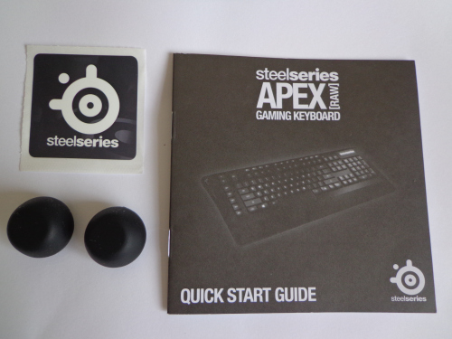Komplektaciją sudaro vartotojo vadovas, papildomi padeliai, mėgstantiems labiau pasvirusias klaviatūras ir „Steelseries“ lipdukas. Tvarkykles iš gamintojo tinklalapio teks atsisiųsti patiems.