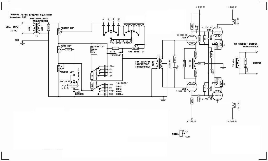 Žinoma, daug kas tuoj puls mane vadinti banditu, kad taip negerbiu originalios schemos, o aš jiems atsakysiu: „pačios „Pultec“ dvasios išėjimo kaskada nekeičia, GALBŪT ši versija skambės truputį kitaip, GALBŪT net geriau“. Kai kažkas iš brolių lietuvių nutars mokėti 7000$ už originalą - mielai atvažiuosiu, palyginsiu ir rimtai apsvarstysiu garso skirtumus. „Ecc83“ - paprastas įtampos kartotuvas, „2k2“ rezistorius galima parinkti skirtingus idealesniam balansui, bet, išmėginus keltą lempų, problemų nepastebėjau. Vielinis potenciometras „Ecc82“ katode skirtas pareguliuoti priešįtampiui, mat „karščiau“ (iki tam tikros ribos) dirbančios lempos skambesys man priimtinesnis.