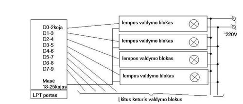 Perdaryta, iš lempos komutavimo per LPT iki šviesos muzikos valdymo panaudojant „Winamp“, gatavą programą galite rasti „Download“ skyriuje šiame puslapyje http://discolitez.com. Bendra struktūrinė schema yra tokia: