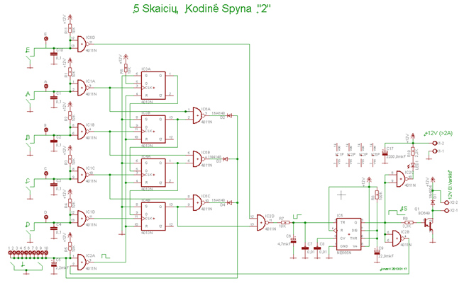 Veikimas: įjungus maitinimą kraunasi kondensatorius C5, loginio elemento IC2A.3 suformuotas „log 1“ („1“) nustato trigerių išėjimus Q į „log 0“ („0“). Ant IC3A.5 išvado yra „1“ (R6 į +12 V). Paspaudus kodo pirmą skaičių A, IC1A.3 suformuotas „1“ į trigerį IC3A.1 įrašo „1“. Ant IC3B.9 išvado jau yra „1“. Paspaudus antrą kodo skaičių B, įrašomas „1“ į trigerį IC3B.13. Taip renkant kodo skaičius vyksta „1“ perstūmimas į IC4B.13 išvadą. Kodo penktas skaičiaus priklauso nuo JP1 trumpiklio E. Gali būti A, B, C. Pvz: ABCDB.