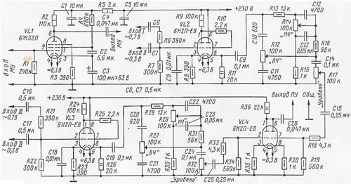 Pirminis stiprintuvas (2 pav.) sudarytas iš mikrofoninio stiprintuvo lempoje VL1, dviejų vienodų laipsnių lempose VL2, VL3, tembro reguliatorių, stiprinimo ir mikšerio lempoje VL4. Kažkokių tai ypatybių stiprintuvas neturi, tik pirminio stiprintuvo lempų kaitinimo siūleliai maitinami pastovia srove.