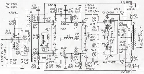 Galinis stiprintuvo laipsnis įgyvendintas pagal dvitaktę schemą lempose ГУ-81М (VL8, VL9) su transformatoriniu išėjimu. Lempų režimas užtikrina anodinės srovės atsilenkimo kampą, artimą 90°, dėl ko pasiekiamas palyginti aukštas stiprintuvo naudingumo koeficientas. Esant maksimaliai galiai anodinė srovė siekia 800 mA, o per pauzes ji sumažėja iki 80–120 mA.