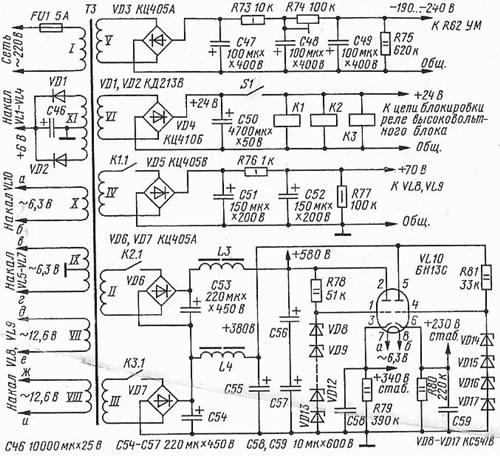 Kintamoji 2600 V įtampa lyginama tiltu iš diodų VD9–VD36 ir toliau išlyginama filtru L2C5, be to minusinė grandinė sujungta su korpusu per droselį. Todėl droselio apvijoje nėra aukštos įtampos ir negalimas karkaso izoliacijos pramušimas į korpusą. Išlyginta 3500 V įtampa skirta ГУ-81М anodinių grandinių maitinimui.