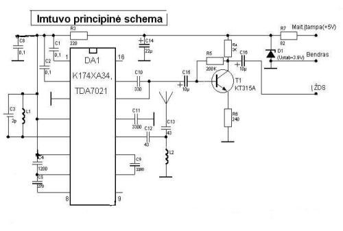 Tai standartinė TDA-7021 schema su nedideliais pakeitimais.
