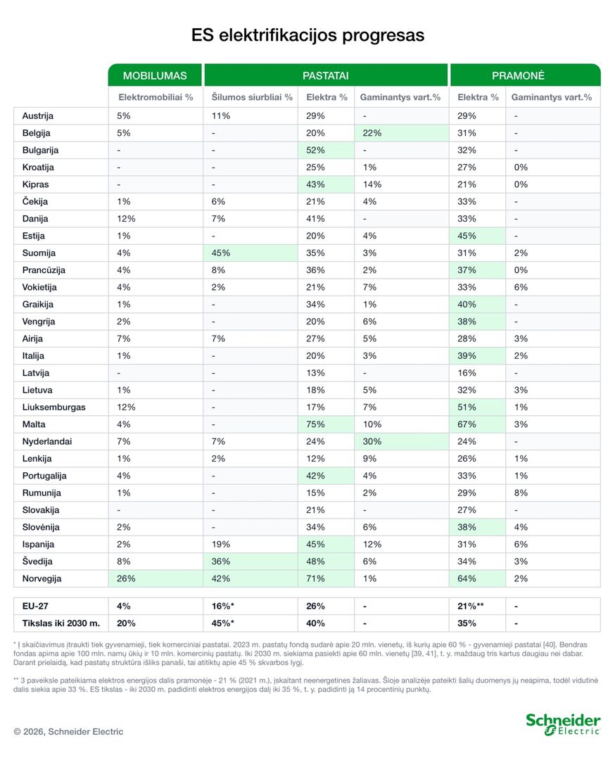 Norvegijoje, šie rodikliai jau gerokai aukštesni: transporto elektrifikacija siekia 26 proc., pastatų – net 71 proc., o pramonės – 64 proc. Tai rodo, kad spartesnė elektrifikacija yra pasiekiama, jei ją remia nuosekli energetikos politika ir investicijos“, – teigia D. Gacicha.